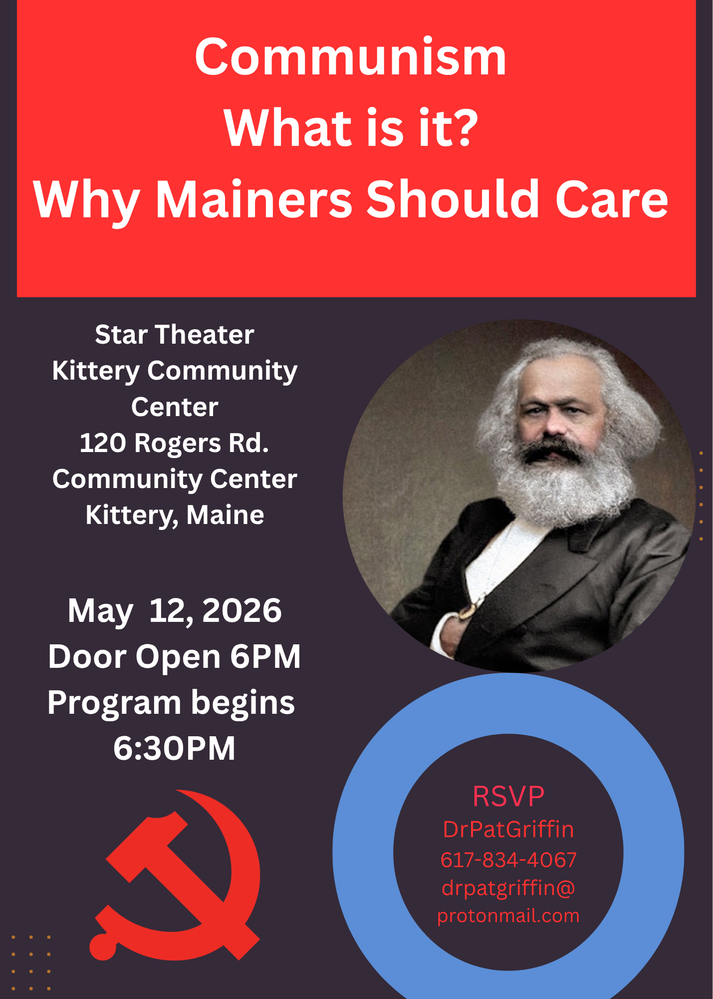 The Kittery and Eliot Town Committees are sponsoring the following program on Communism and invite you to attend. Dr. Pat Griffin has organized a panel of speakers on this important topic in light of the threat that Communism plays in our country and world today.
